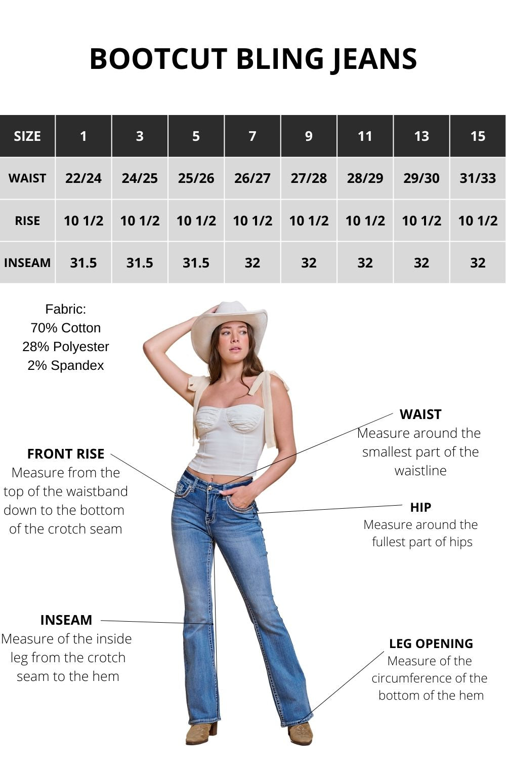 - 5-POCKET STYLE. EMBROIDERED BACK POCKETS WITH FAUX LEATHER AND RHINESTONE RIVETS